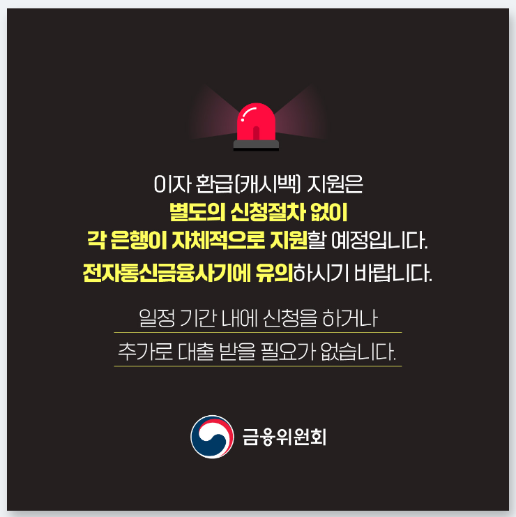 ▶ 소상공인이 캐시백을 받기 위한 조건으로 ➊일정 기간 내에 신청을 하거나, ➋추가로 대출을 받을 필요는 없으므로 전자통신금융사기에 유의하시기 바람.