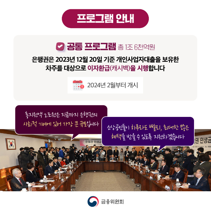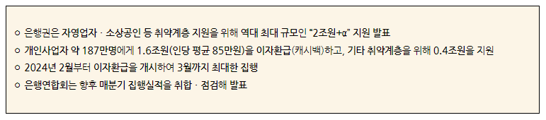 ㅇ (공통 프로그램) 은행권은 공통 프로그램으로서 ’ 23.12.20일 기준(발표전일 마감 기준) 개인사업자대출을 보유한 차주를 대상으로 이자환급(캐시백)을 시행합니다.