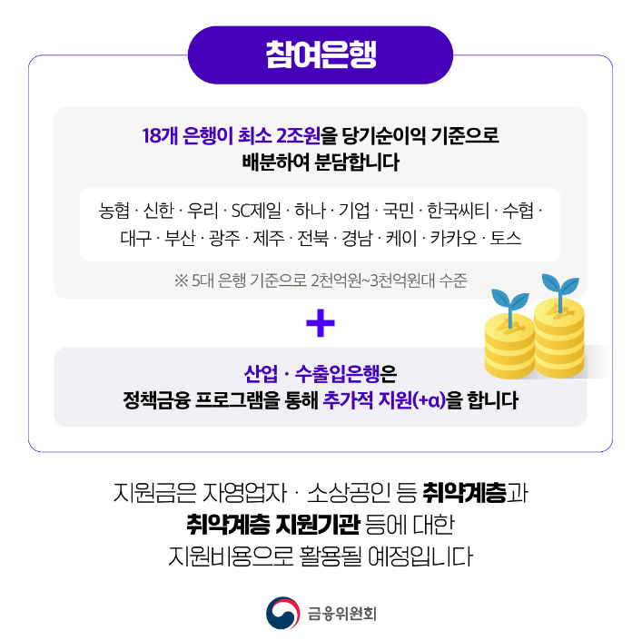 ㅇ 이후 남는 재원으로 자영업자ㆍ소상공인 이외의 위기에 처한 취약계층을 은행 자율적으로 다양하게 지원하고자 하는 것이 지원 프로그램을 구분한 이유임