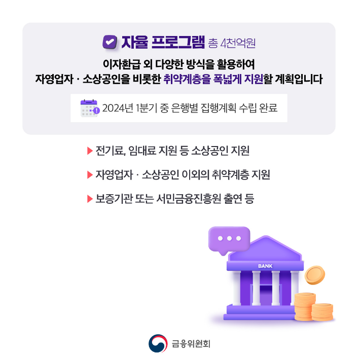 ㅇ 또한, 자율 프로그램의 경우에도 ’ 24.1분기중 은행별 집행계획 수립을 완료하고 연내 속도감 있게 집행해 나갈 계획을 갖고 있습니다.