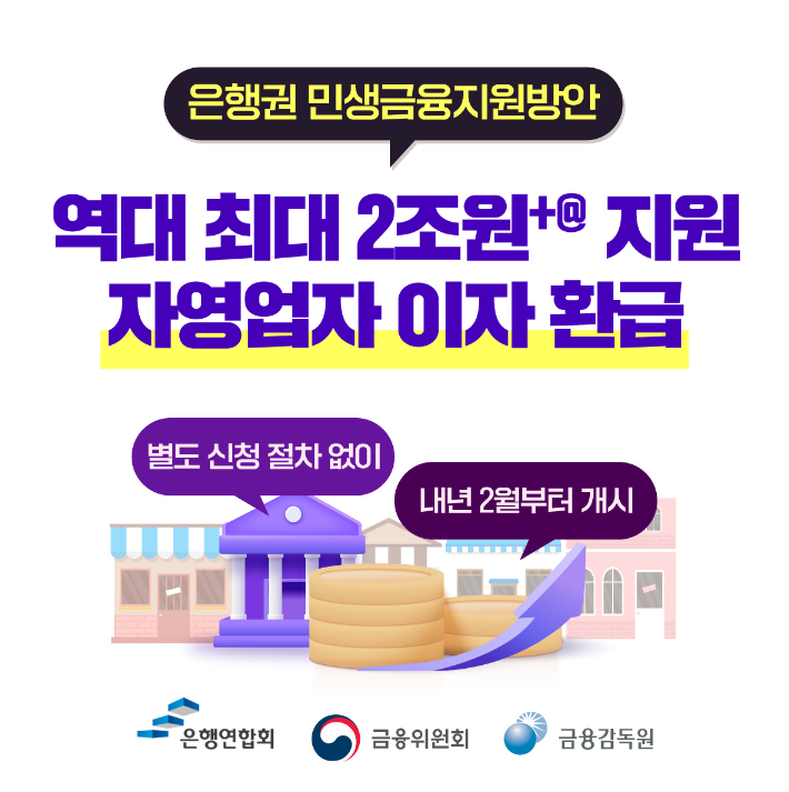 -정부에서 소상공인, 저소득층을 위해 이자를 환급해 주는 제도입니다. 2월 5일부터 2월 8일까지 1차적으로 185만 명의 소상공인을 대상으로 지급을 하고, 2차적으로는 3월부터 중소금융권 이자 환급이 시행됩니다.