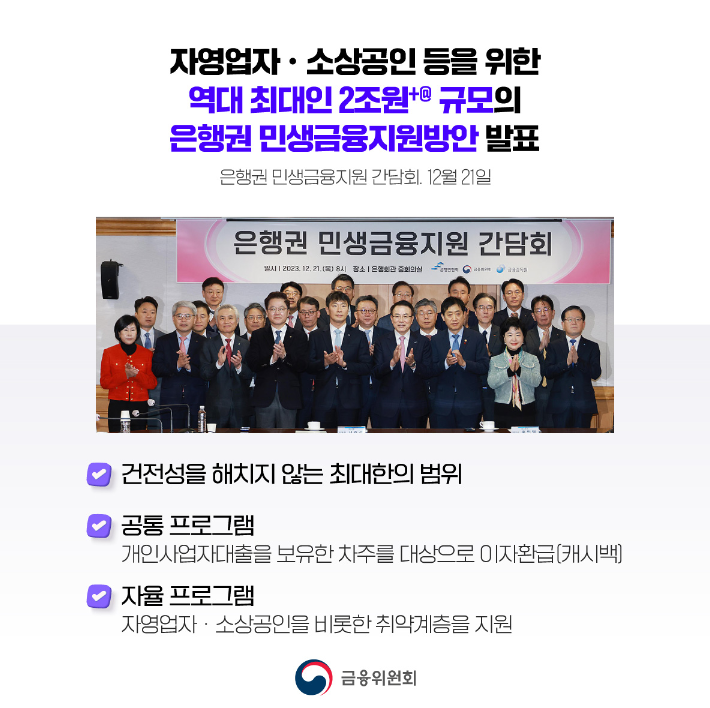 「은행권 민생금융지원방안」은 은행의 ‘건전성을 해치지 않는 최대한의 범위’에서 코로나 종료 이후 높아진 ‘금리부담의 일정 수준’을’을 ‘직접적으로 낮춰줄 수 있는, 체감할 수 있는 방안’을 마련한 것입니다. 이는 자영업자ㆍ소상공인 이자부담 경감을 위한 공동의 사회적 역할을 확대키로 한데 따른 후속조치로, 11월 하순부터 은행권 TF*를 통해 신속한 논의와 의견수렴 과정을 거쳐 마련되었습니다. 본 방안은 국내 20개 모든 은행의 참여를 통해 “2조 원+α” 규모로 추진된다.