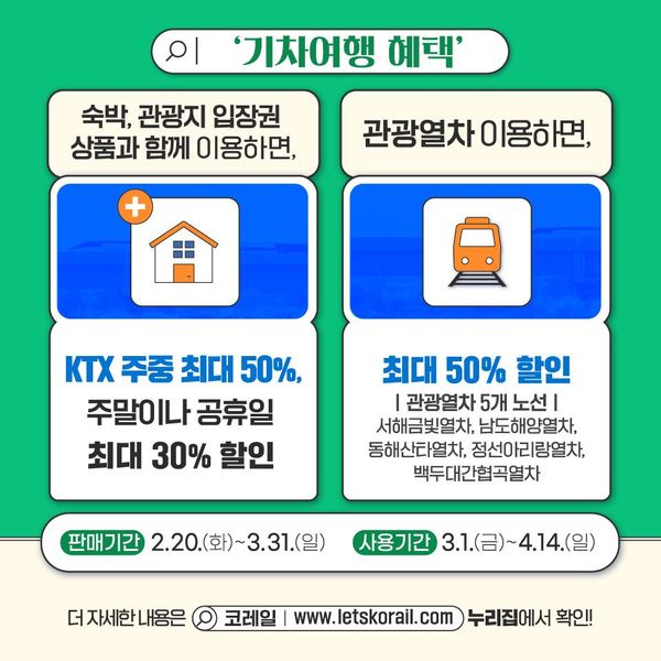 (철도) ① 숙박/관광지 입장·체험권 등과 결합 구매 시 KTX 요금 최대 주중 50%,