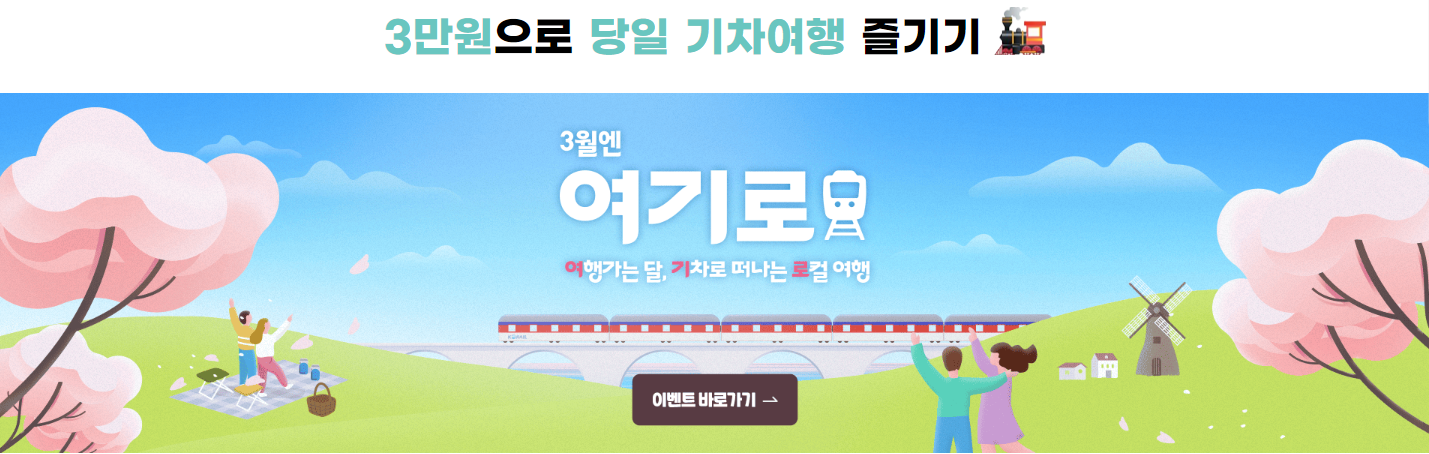 1,700여 명이 전국 21개 소도시로 떠나는 당일 기차여행 행사 ‘3월엔 여기로(여행가는 달, 기차로 떠나는, 로컬 여행)’도 진행됩니다. 이 행사는 지역의 떠오르는 명소, 전통문화 및 지역특산물, 전통시장 등을 총 23개 코스로 체험할 수 있는 당일치기 기차여행으로, 3만 원만 부담하면 교통부터 식사, 관광지 입장까지 모두 해결할 수 있고. 3월 8일부터 3월 말까지 매주 금요일, 토요일에 총 7회 ‘여기로’ 전용 열차가 출발하며, 본인 포함 최대 4매까지 신청할 수 있습니다.