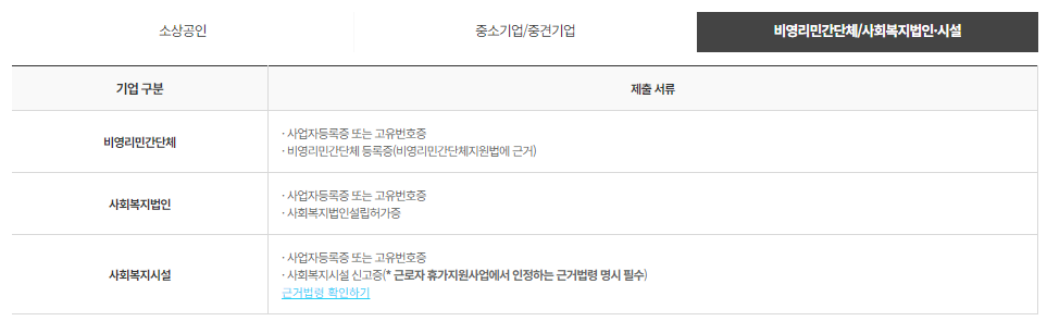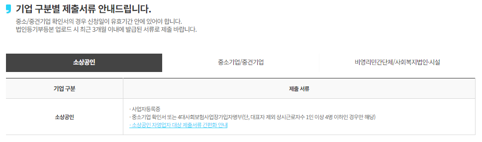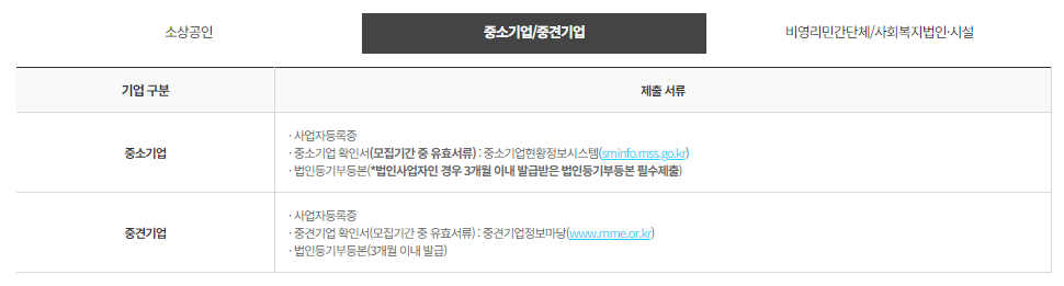 중소기업/소상공인 → 중소기업확인서, 사업자등록증 각 1부(중소기업확인서는 중소기업현황정보시스템