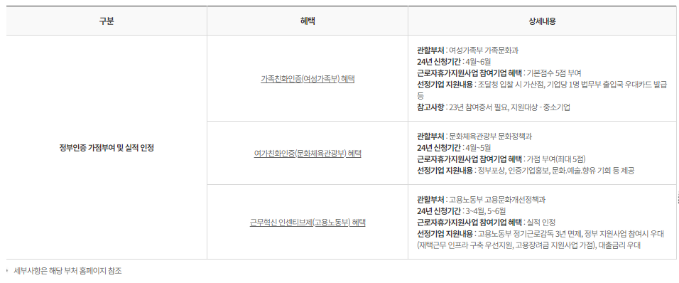 - 참여증서 발급, 정부인증* 가점 부여 및 실적 인정(가족친화인증, 여가 친화인증, 근무혁신 인센티브제 등)