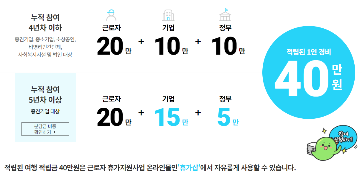 - 정부와 기업, 근로자가 공동으로 비용 조성 후, 휴가 시 국내여행에 사용하면 됩니다.