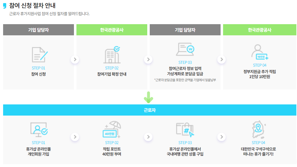 (기업) 참여신청 → (공사) 참여기업 확정 → (기업) 기업/근로자 분담금 일괄 입금 및 근로자 정보 등 제출 → (공사) 정부지원금 추가적립 및 휴가샵 온라인몰에 40만원 포인트 부여 → (근로자) 휴가샵 온라인몰에서 포인트 사용