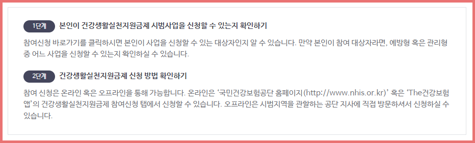 국민건강보험공단 시범사업 지역 지사 방문을 통해 신청 가능합니다.