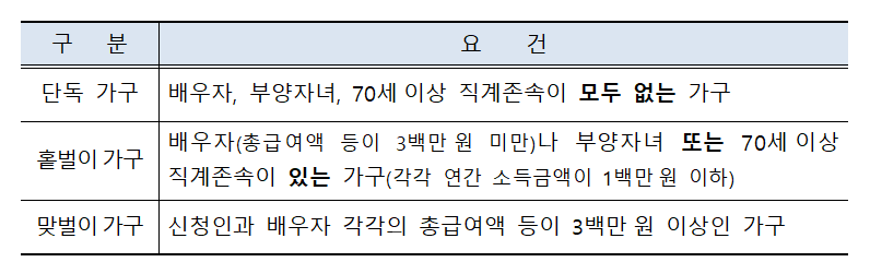 <가구요건> 1가구에 1명만 신청할 수 있으며, 배우자 · 부양 가족 유무에 따라 구분합니다.