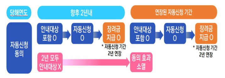 ○장려금 신청기간 중 자동신청에 1번만 동의하면 향후 2년 내 신청 안내대상에 포함될 때 해당 장려금이 자동으로