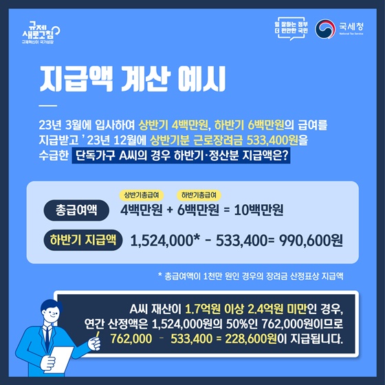 근로장 려금 533,400원을 수급한 단독가구 A씨의 경우 하반기 · 정산분 지급액은 ?