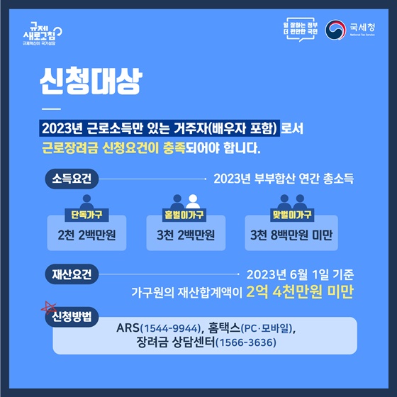 ○ 국세청(청장 김창기)은 저소득 가구의 근로를 장려하고 경제적 자립을 적극적으로 지원하기 위해 3월 1일부터 15일까지 2023년 귀속 하반기분 근로소득에 대한 근로장려금 신청을 받습니다.