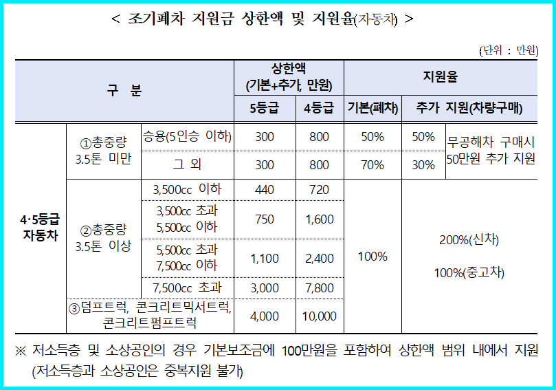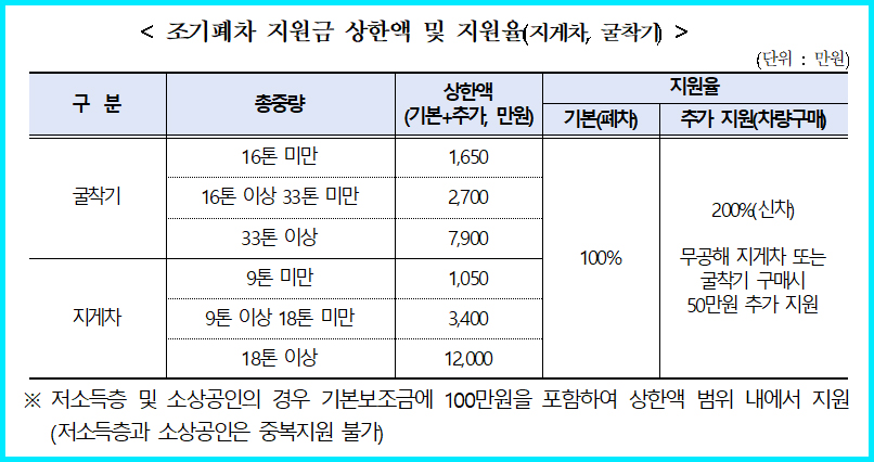 - 총중량 3.5톤 이상 자동차 및 건설기계 조기폐차 신청은 6개월 이상 소유하여야 함