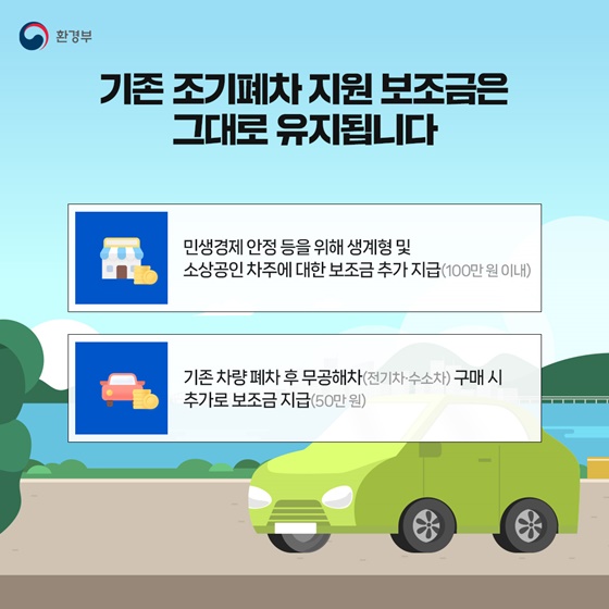 | ✓ 추가 보조금 지급 청구서류 : | 1. [별지 제5호 서식] 조기폐차 추가보조금 지급청구서 (추가보조금 지급청구서는 반드시 원본 제출) 2. 신규 자동차 등록증 3. 자동차 소유자가 보조금을 받을 수 있는 통장사본 |