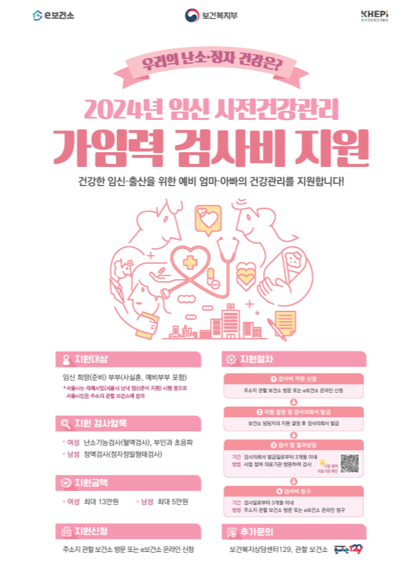여성 13만 원(난소기능검사, 부인과 초음파), 남성 5만 원(정액검사)을 지원받을 수 있게 됩니다.