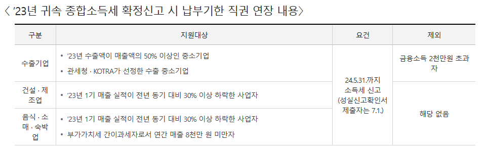 ▷ 2023년 귀속 종합소득세 확정신고·납부와 관련하여 국세청에서는 복합 경제위기 등으로 경영에 어려움을