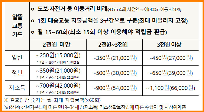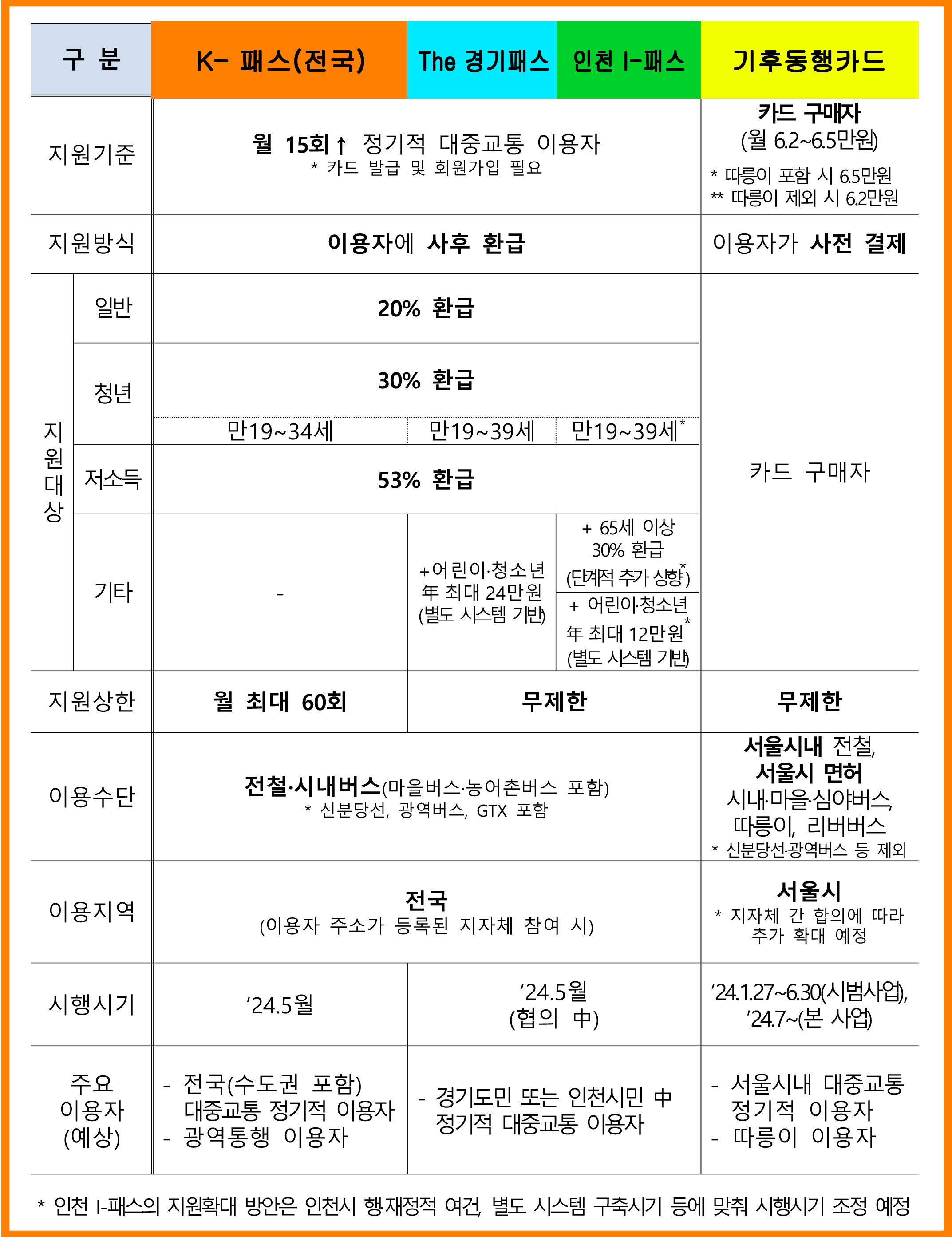 서울시는 수도권 시민의 교통비 부담을 완화하고 대중교통을 활성하하는 정부 정책에 발맞춰, 1회 6만 원대의 요금충전으로 서울시내 대중교통(지하철, 버스) 따릉이를 무제한 이용할 수 있는 대중교통 통합 정기권입니다. 2024년 1월 27일부터 시행할 계획입니다.