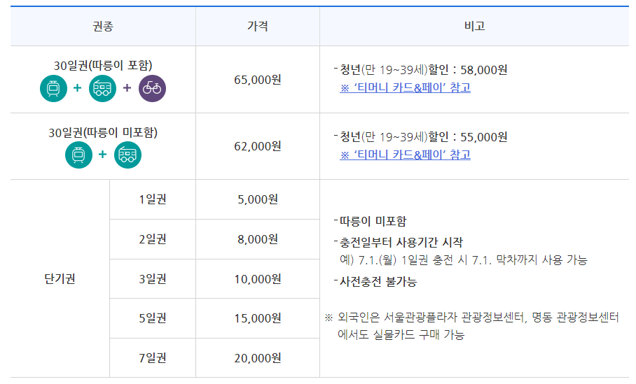 - 하루 동안 무제한으로 대중교통을 이용할 수 있는 권한을 제공합니다. 주로 관광객이나 단기 방문객에게 유용합니다.