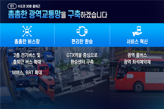 충분한 광역버스 공급과 BRT확충 등으로 철도 사각지대를 줄이고 신도시의 이동 편의성을 대폭 개선합니다.