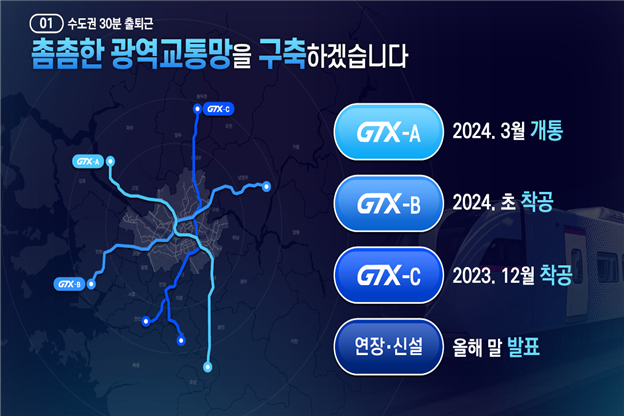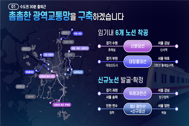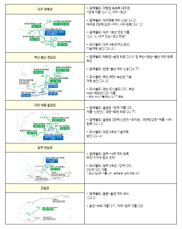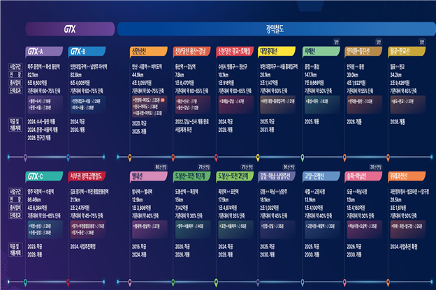 서울8호선 별내 연장(24년), 신안산선(25년), 서울 7호선 옥정연장(26년)등 3개 사업은 순차적으로 개통할 계획이며, 신분당선 광교 ~ 호매실(24년), 서울 7호선 포천연장(24년), 대장홍대선(25년), 고양은평선(25년), 서울 9호선 강동, 하남, 남양주 연장(25년), 서울 3호선 하남 연장(26년)등 6개 광역철도 사업도 착공합니다.