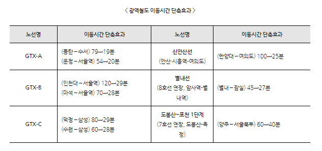 GTX 사업은 수도권의 교통난 해소뿐 아니라 좋은 입니의 희소가치를 분산시켜 근본적인 주거안정을 도모하는 핵심사업이며 기획연구글 통해 다양한 조기 추진방안을 마련 국민들의 출퇴근 시간을 돌려준다는 핵심으로 사업을 추진하였으며, GTX 노선 인근에 컴팩트시티 조성을 함께 검토하여 추가 수요와 재원을 확보하고 역세권에 양질의 주택을 공급하겠다는 계획입니다.