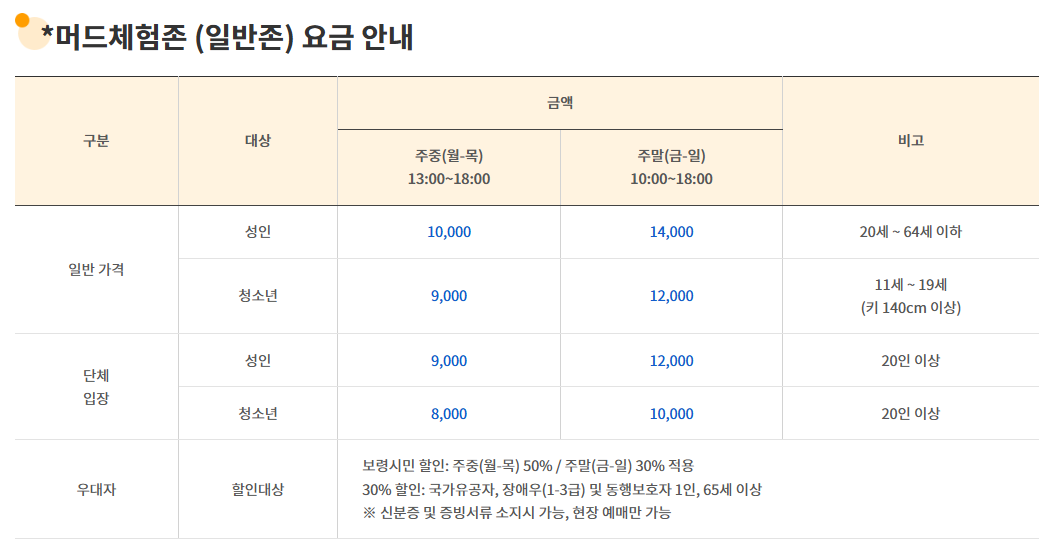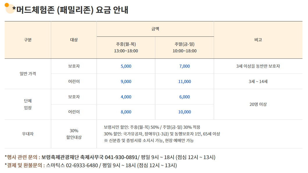 머드체험(일반존/패밀리존/워터파크존)(주중) 13:00 ~ 18:00※7.24.(수) 안전 점검으로 인해 체험존 미운영하오니 예매 시 참고 부탁드립니다.