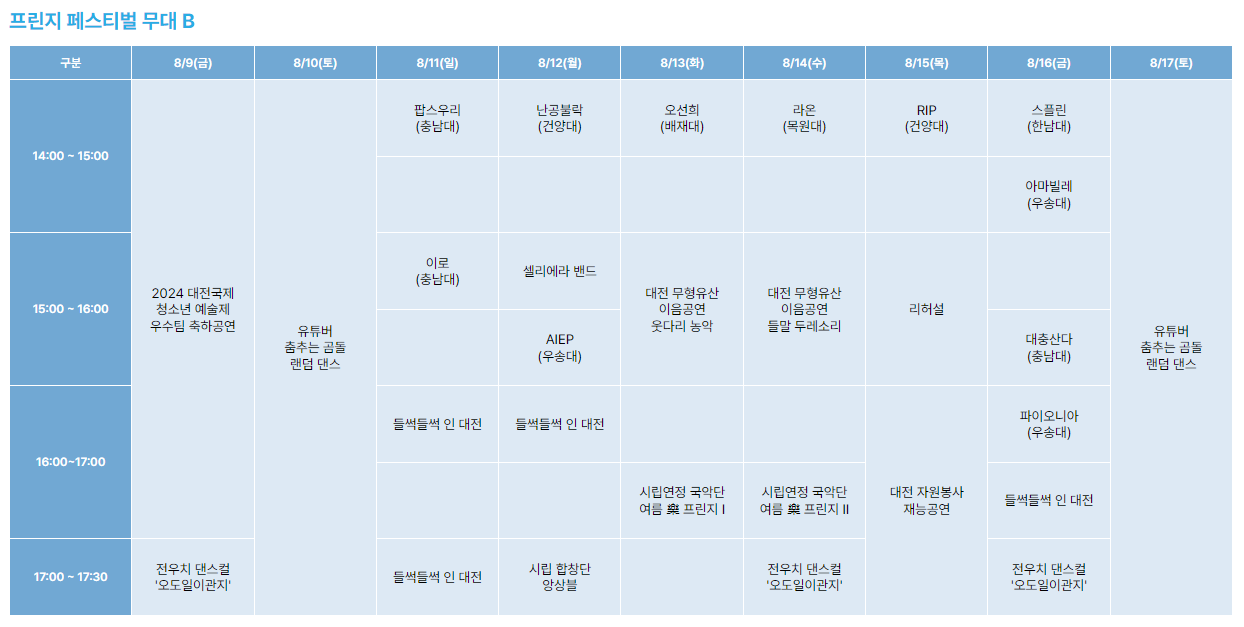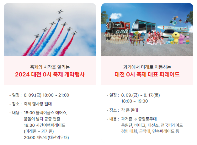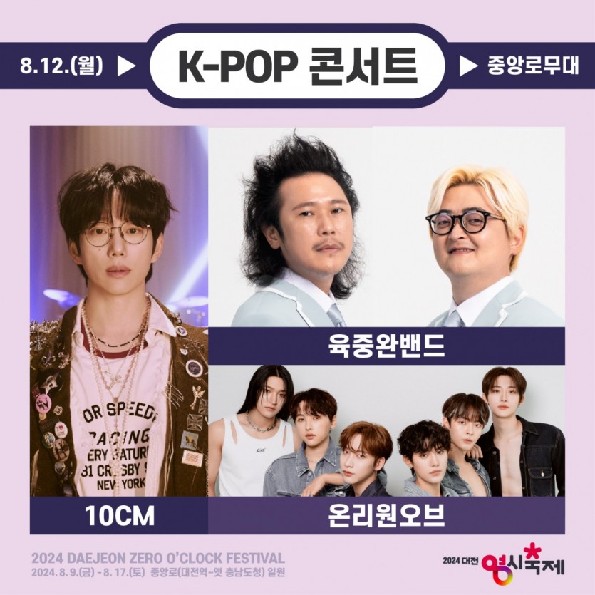 대전 0시 축제는 ‘시간여행 축제’라는 차별화된 주제를 바탕으로 대전역에서 옛충남도청까지 중앙로 1km 구간을 차없는 거리로 운영하며 구역마다 대전의 과거와 현재, 미래를 만날 수 있어요. 올해는 중앙로 길거리 프린지 무대와 함께 인근 소극장에서 다양한 무대가 펼쳐집니다.