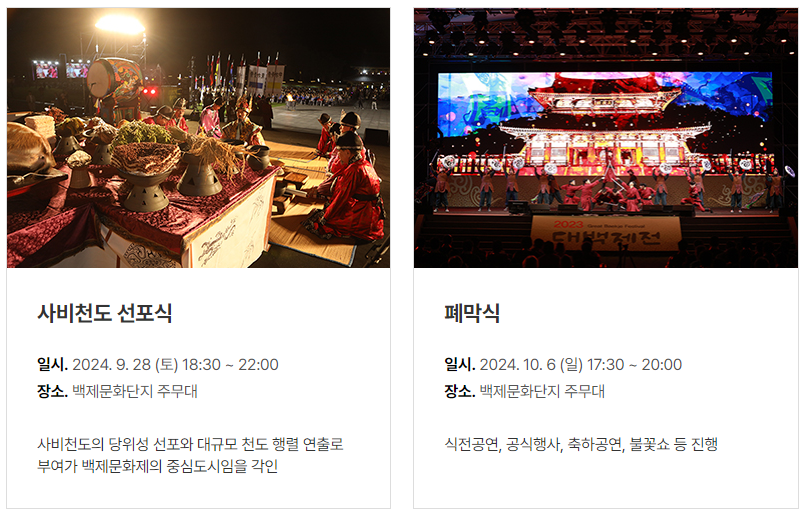 1. 공식프로그램 - 개막식 및 사비천도 선포식 : 행렬, 정도공유제, 축하공연 - 폐막식 : 하이라이트 영상, 폐막선언 등