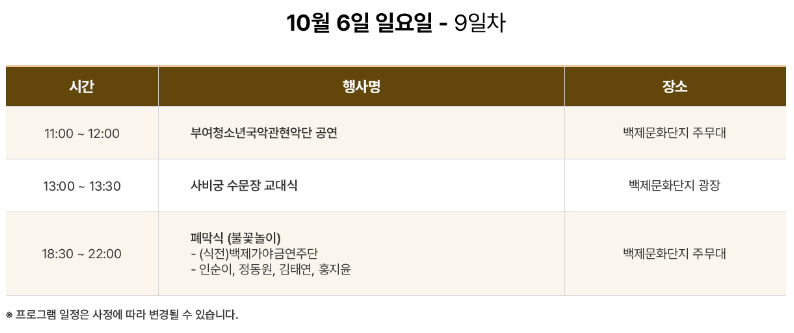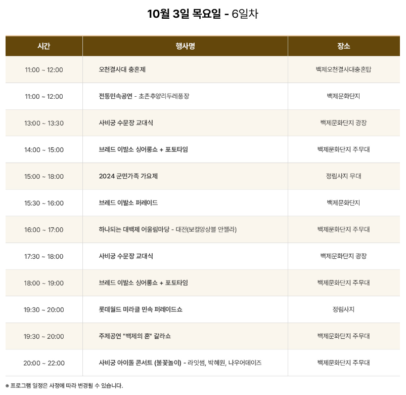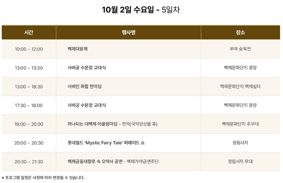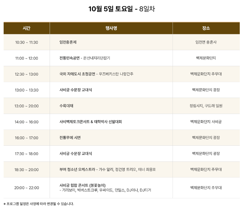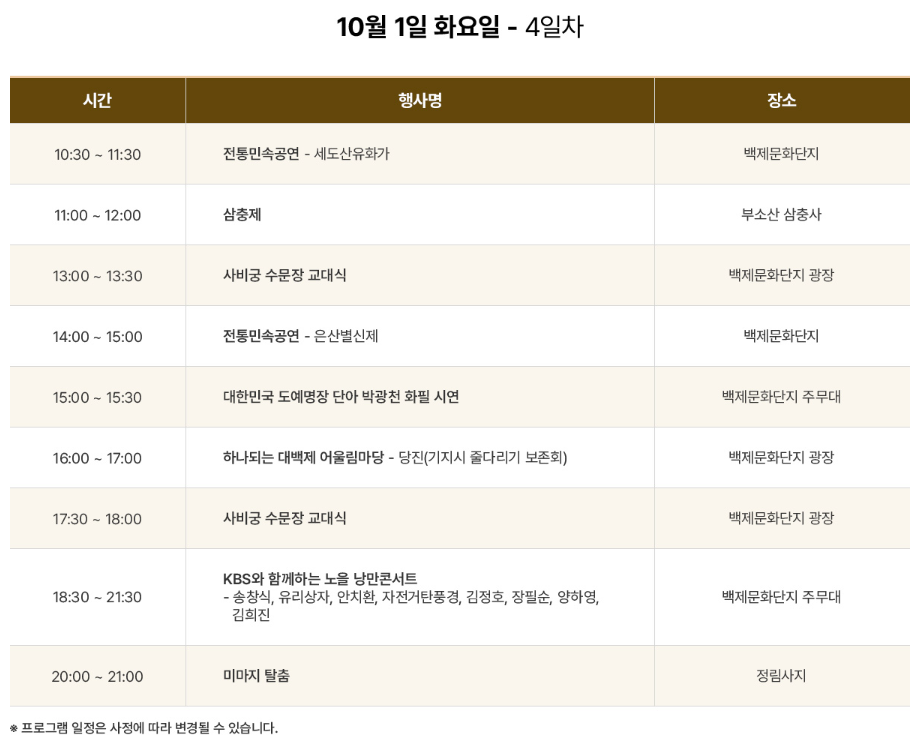 부여백제문화제는 매년 가을에 개최되며, 백제의 역사적 유적지와 아름다운 자연경관 속에서 열리고 있습니다. 축제는 다양한 공연, 전시, 체험 프로그램으로 구성되어 있어 가족 단위 관람객들에게도 좋을 것 같애요. 올해는 특히 백제문화제가 70살을 맞이하는 역사적인 해로써 '아름다운 백제 빛나는 사비 부여'라는 캐치 플레이즈로 백제문화제단지에서 행사를 하고 있습니다.